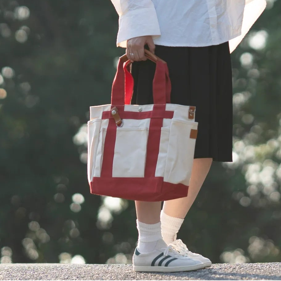 ガーデニング用の収納力を、日常にフィットする機能性へ。 多ポケット構造や大容量設計など、ガーデンバッグならではの使いやすさをベースに、街使いに適したデザインへと再構築しました。 大小合わせて13個のポケットがついており、こまごましたものを整理できる収納力の高いカバンです。強くなめらかなアーミーダック生地を引き立てるべく、ハンドルをレザーでくるみ、堅牢さと高級感を加えました。 こだわりのデザイン 1枚仕立てでも自立できるフォルム 厚みのある18オンスのアーミーダック生地で作られたカバンは、裏無しでもしっかりと自立します。底部分は生地が2枚重ねになっており、カバンの土台を支えます。 たっぷり13個のポケット 外側に配置されたポケットは、荷物の出し入れがしやすいよう立体的に作られており、ぷっくり膨らむフォルムが優しい印象です。8つの外ポケット、便利な収納設計 フロントポケット×2:スマートフォンやイヤホンなど、すぐに取り出したい小物に最適。サイドポケット×2:ペットボトル・水筒・折り畳み傘などを入れやすい長め設計。ハンドル横ポケット×4:ペンや充電コードなど細長いアイテムの収納に便利。外ポケット全体:読みかけの本やノートなどもサッと差し込めます。 ※2024年6月販売分よりサイドのDカンは標準装備です。 3つの内側ポケット  カバンの側面に吊り下げられたポケットは、お財布や名刺入れなど入れておくと大きなカバンでも迷子になりません。 2つの内側ペン差し 4色ボールペンもゆったり入る大きさです。 肩掛けできる安心設計の持ち手 ・荷物が多い日も快適に持てる長さ・中央にはレザーカバーを採用し、使い込むほど味わい深い飴色に ショルダーバッグとしても 別売りの「ショルダーパーツ」をDカンにつけていただくと、ショルダ―バッグとしてお使いいただけます。 「帆布シリーズ向けショルダーパーツ」はこちら 「デイジーチェーン」で吊り下げ収納 アウトドアリュックなどによくつけられている「デイジーチェーン」をカバンの片側にデザインしています。デイジーチェーンはアウトドア用品をぶら下げて収納するためのベルトで、カラビナやひもをベルトに通してアイテムを収納します。カワニシカバンでは、カラビナの代わりに専用のレザーのタグ「Dカンチャーム」をご用意しました。アウトドアモチーフをタウンユースのバッグに上品に落とし込みました。 Dカンチャームは追加でご購入いただけます。 ↓「Dカンチャーム」はこちらから  カラー展開 キナリ、レッド、オリーブ、グレーベージュをご用意しています。 サイズ 高さ:30cm 幅:30cm マチ幅:15cm 持ち手長さ:18cm 重さ  800g 容量  約13.5L ※仕様デザインについては、使いやすさ、品質向上のため予告なしに変更する場合がございます。ご了承ください。   カワニシカバンの「大人帆布」トートバッグ比較 左からgrabe[グレーブ]、grabe mini[グレーブミニ] ■ご購入前に必ずご確認ください 【大人帆布生地の染色について】 ・一部の商品(特に赤色の生地)につきましては、色堅牢度の基準はクリアしておりますが、気温や時期によっては色移りが発生しやすい場合がございます。色落ちや色移りは、染物生地の特性です。あらかじめご理解いただけますようお願い申し上げます。 ・雨天でのご使用や、汗・水分を含んだ場合、または衣類等との摩擦により、多少の色落ち・色移りする事もありますのでご注意下さい。...