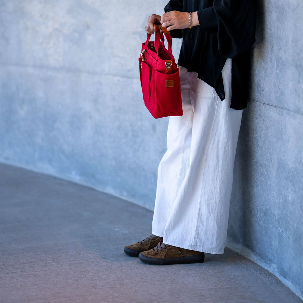 ガーデニング用の収納力を、日常にフィットする機能性へ。 多ポケット構造や大容量設計など、ガーデンバッグならではの使いやすさをベースに、街使いに適したデザインへと再構築しました。 大小合わせて13個のポケットがついており、こまごましたものを整理できる収納力の高いカバンです。強くなめらかなアーミーダック生地を引き立てるべく、ハンドルをレザーでくるみ、堅牢さと高級感を加えました。 こだわりのデザイン 1枚仕立てでも自立できるフォルム 厚みのある18オンスのアーミーダック生地で作られたカバンは、裏無しでもしっかりと自立します。底部分は生地が2枚重ねになっており、カバンの土台を支えます。 たっぷり13個のポケット 外側に配置されたポケットは、荷物の出し入れがしやすいよう立体的に作られており、ぷっくり膨らむフォルムが優しい印象です。8つの外ポケット、便利な収納設計 フロントポケット×2:スマートフォンやイヤホンなど、すぐに取り出したい小物に最適。サイドポケット×2:ペットボトル・水筒・折り畳み傘などを入れやすい長め設計。ハンドル横ポケット×4:ペンや充電コードなど細長いアイテムの収納に便利。外ポケット全体:読みかけの本やノートなどもサッと差し込めます。 ※2024年6月販売分よりサイドのDカンは標準装備です。 3つの内側ポケット カバンの側面に吊り下げられたポケットは、お財布や名刺入れなど入れておくと大きなカバンでも迷子になりません。 2つの内側ペン差し 4色ボールペンもゆったり入る大きさです。 肩掛けできる安心設計の持ち手 ・荷物が多い日も快適に持てる長さ・中央にはレザーカバーを採用し、使い込むほど味わい深い飴色に ショルダーバッグとしても 別売りの「ショルダーパーツ」をDカンにつけていただくと、ショルダ―バッグとしてお使いいただけます。 「帆布シリーズ向けショルダーパーツ」はこちら 「デイジーチェーン」で吊り下げ収納 アウトドアリュックなどによくつけられている「デイジーチェーン」をカバンの片側にデザインしています。デイジーチェーンはアウトドア用品をぶら下げて収納するためのベルトで、カラビナやひもをベルトに通してアイテムを収納します。カワニシカバンでは、カラビナの代わりに専用のレザーのタグ「Dカンチャーム」をご用意しました。アウトドアモチーフをタウンユースのバッグに上品に落とし込みました。 Dカンチャームは追加でご購入いただけます。 ↓「Dカンチャーム」はこちらから カラー展開 キナリ、レッド、オリーブ、グレーベージュをご用意しています。 サイズ 高さ:30cm 幅:30cm マチ幅:15cm 持ち手長さ:18cm 重さ 800g 容量 約13.5L ※仕様デザインについては、使いやすさ、品質向上のため予告なしに変更する場合がございます。ご了承ください。 カワニシカバンの「大人帆布」トートバッグ比較 左からgrabe[グレーブ]、grabe mini[グレーブミニ] ■ご購入前に必ずご確認ください 【大人帆布生地の染色について】 ・一部の商品(特に赤色の生地)につきましては、色堅牢度の基準はクリアしておりますが、気温や時期によっては色移りが発生しやすい場合がございます。色落ちや色移りは、染物生地の特性です。あらかじめご理解いただけますようお願い申し上げます。 ・雨天でのご使用や、汗・水分を含んだ場合、または衣類等との摩擦により、多少の色落ち・色移りする事もありますのでご注意下さい。...