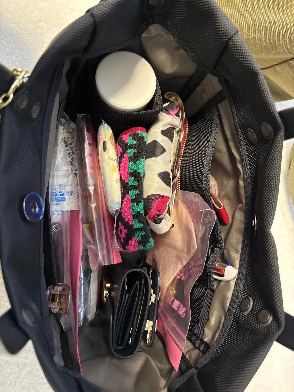 サイドを留めた状態でも、荷物の出し入れがスムーズ。見た目を崩さず、使いやすさを高めています。